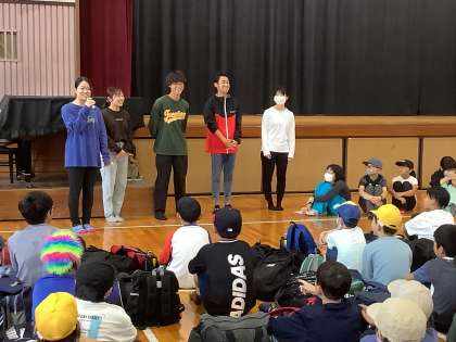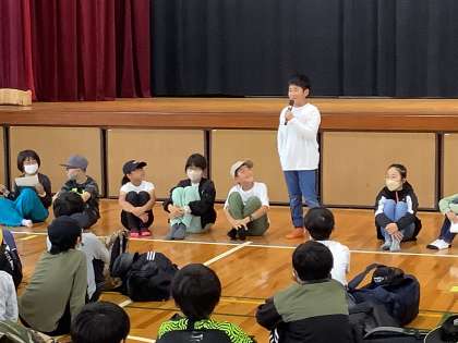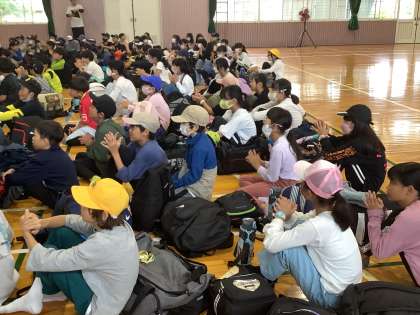 5年生が今日と明日、自然教室に出かけます。出発式を行いました。天気が心配ですが、元気に過ごせるといいです。