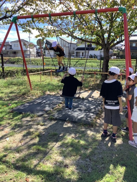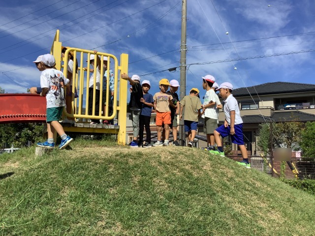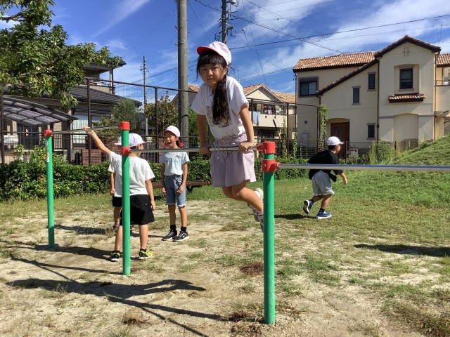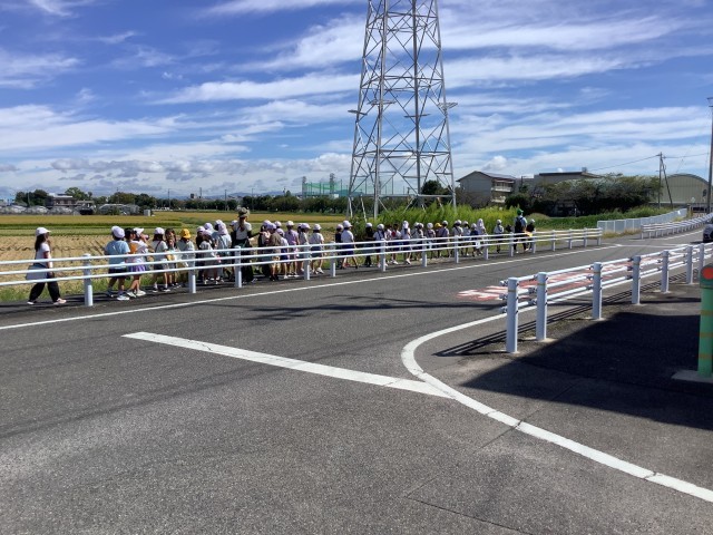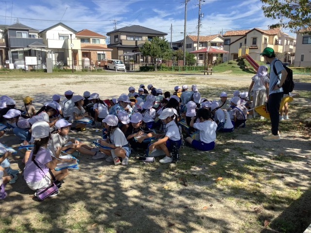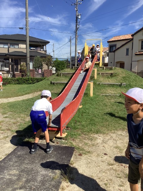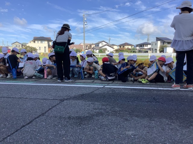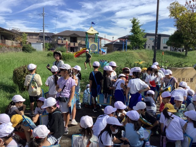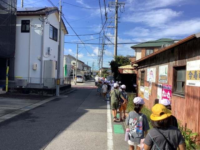 今日の学区たんけんは、青コースに出かけました。青コースは、住宅が多く、公園もあります。「僕の家はこの近くだよ」「近くにそろばん教室があるよ」と、友達に教える姿がありました。公園で少しの時間遊んで、無事に帰りました。