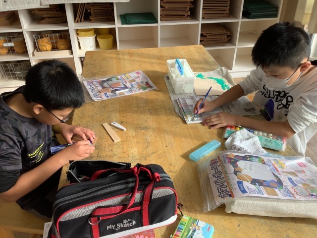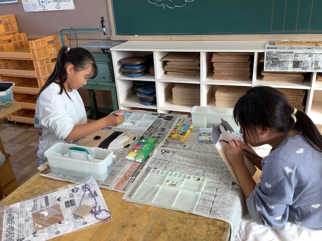 電動糸のこぎりでシナ板を切り、絵の具で色をつけ、ホワイトボードシートを貼ります。