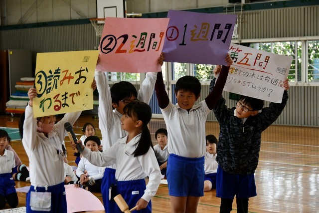 11月12日(水)総合的な学習の一環として、1組は石橋地区の方々と体育館で交流会を行いました。子どもたちは、地域の方々に楽しんでいただこうと、クイズ大会とボッチャの2種類を企画しました。終わったあと、クイズを一生懸命に考えてよかった、地域の方々が楽しんでくれたと、子どもたちは喜んでいました。ご来校いただいた皆様、本当にありがとうございました。