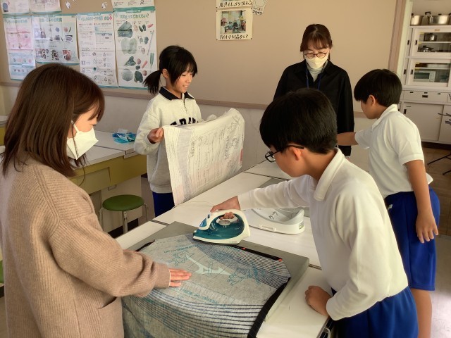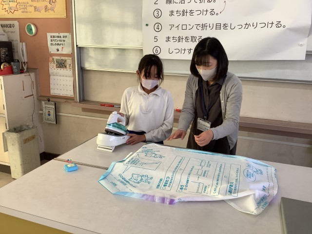 布を裁ち、まち針を打ち、アイロンで折り目をつけます。