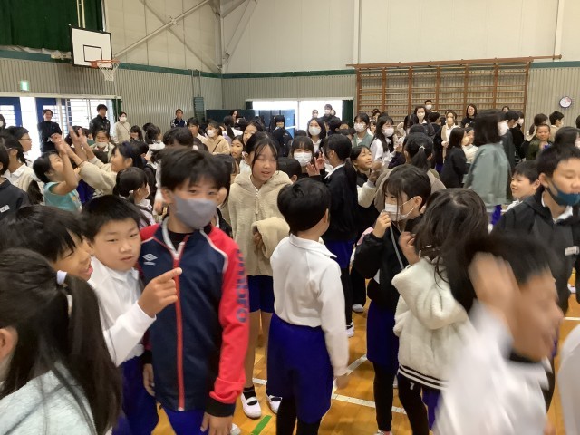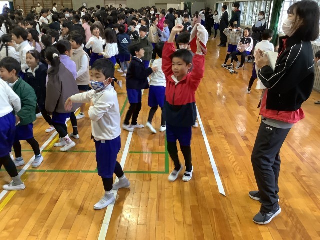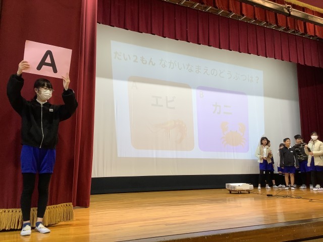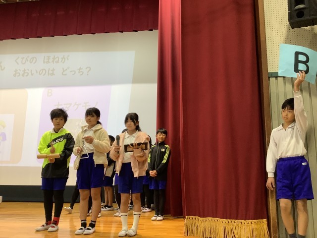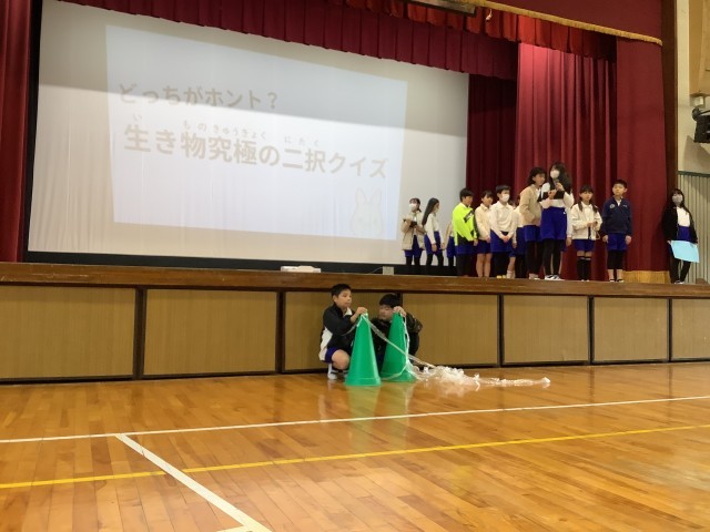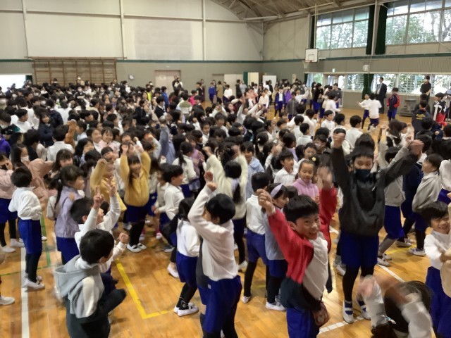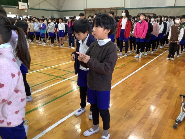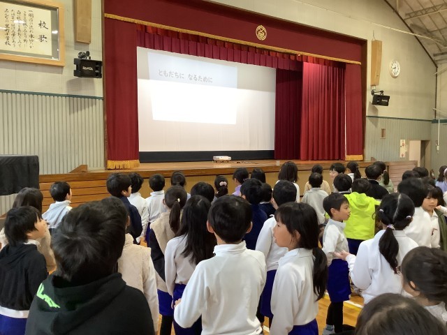 児童集会では、花壇飼育委員会が「生き物2択クイズ」を発表しました。正解したら、飛び上がって喜ぶ子がたくさんいました。最後は、今月の歌「友だちになるために」を歌いました。中には、手話を使いながら歌っている子もいました♪