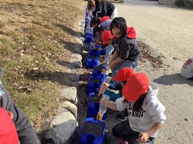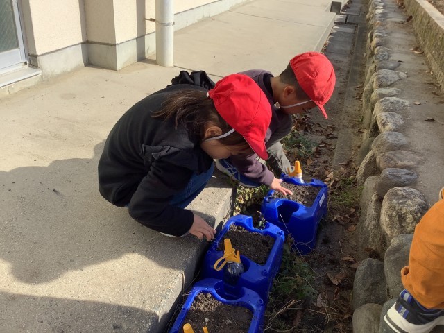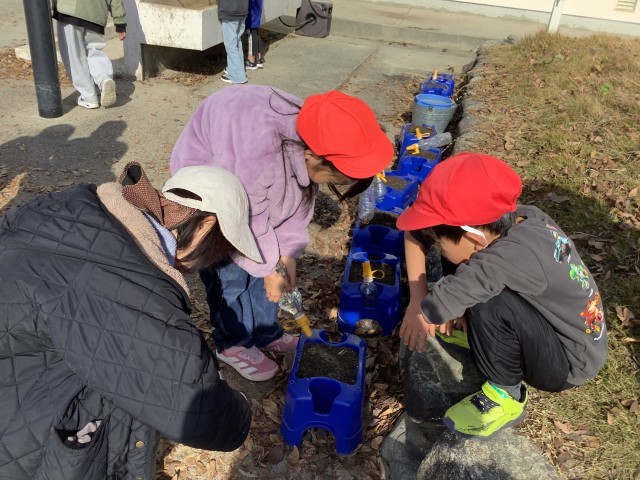 アサガオのつるや支柱を片付けた鉢に土を入れ、肥料を混ぜます。