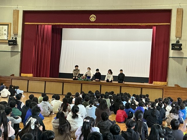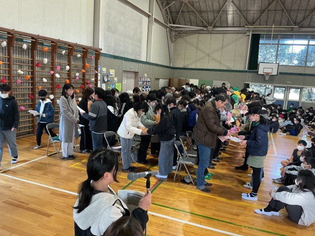 代表児童から手紙と花束をプレゼントした後、感謝の気持ちをこめて、全校児童で「ありがとうの花」を歌いました。