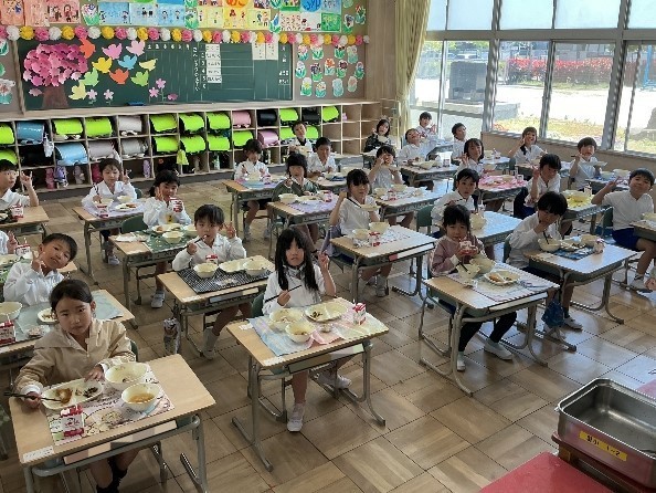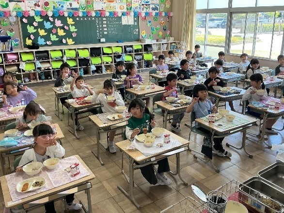 次は,給食を食べる1年生の様子です。