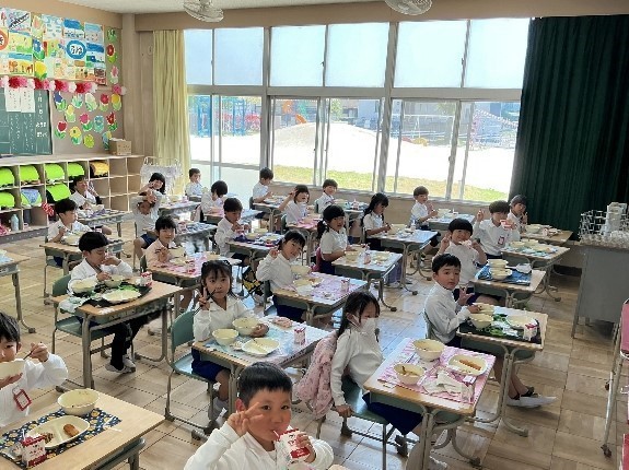 次は,給食を食べる1年生の様子です。