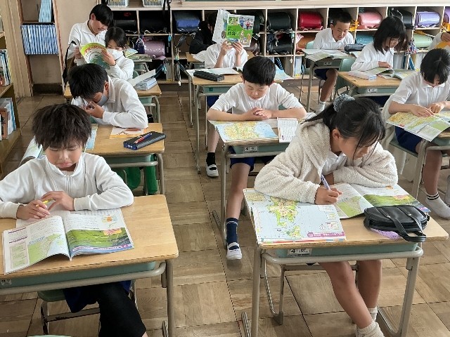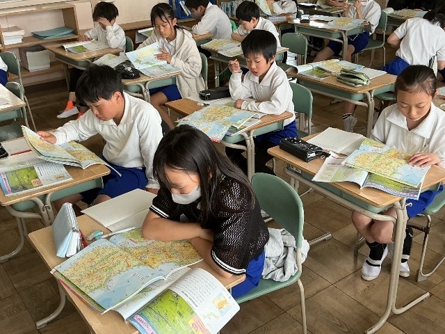 1組は,社会科で地図帳を使って東北地方の地名を確認しています。
