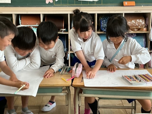 1時間目,3組では学校探検をする1年生へのクイズづくりをしました。