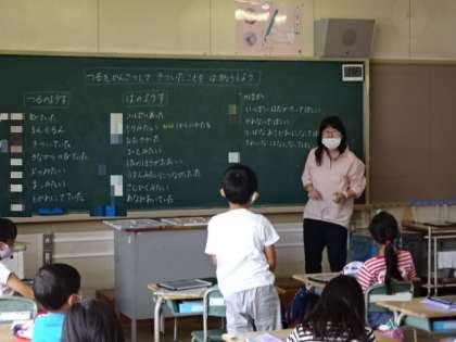 今日は、あさがおのつるを観察して気づいたことを発表しました。つるの様子からは、「くるんくるんとのびていた。」「まきついていた。」、葉の様子からは、「ハートみたい。」「大きかった。」などの意見が出ていました。