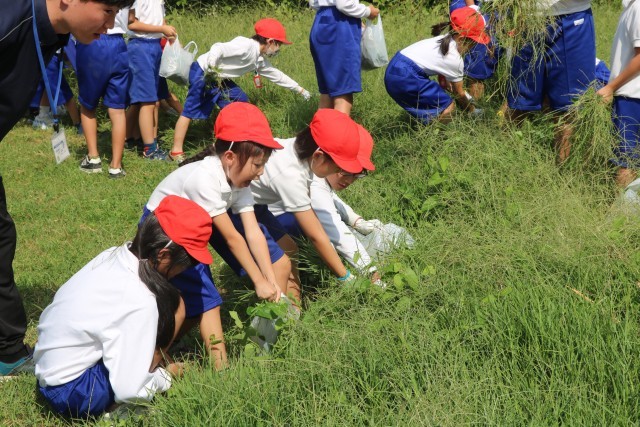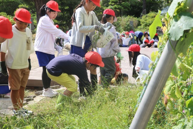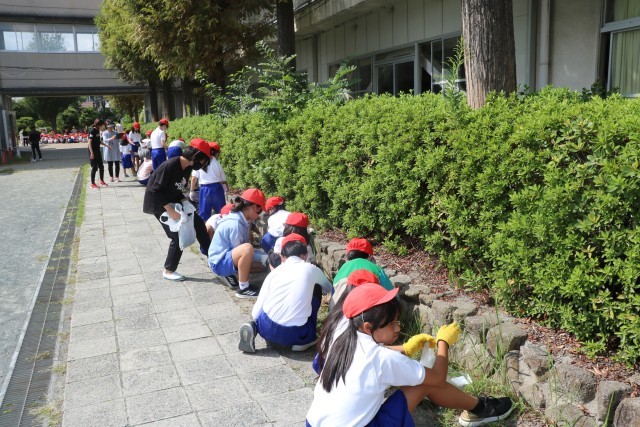 グリーンタイムを行いました。10月1日~11月12日の水曜日の掃除の時間、ペアで草取りをします。みんな頑張って草をとり、ビニール袋いっぱいになりました。