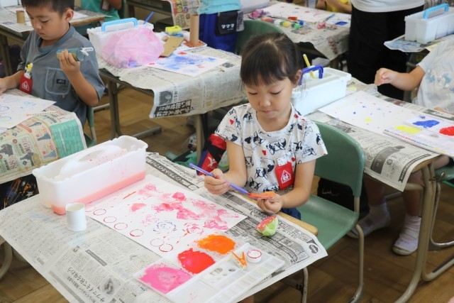 「スタンプぺったん」を行いました。様々なものに絵の具をつけてスタンプにして、見事な作品を完成させました。