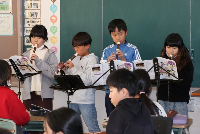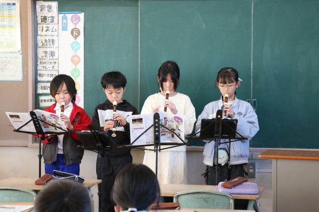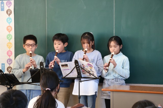 リコーダーで「陽気な船長」の発表会を行いました。みんな真剣に行っていました。