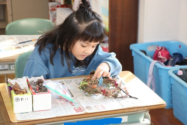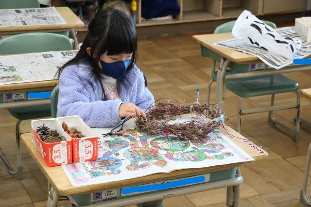 秋の実のリース作りを行いました。どんぐりやリボンをつけるなど、思い思いにつくり、きれいな作品を完成させましました。