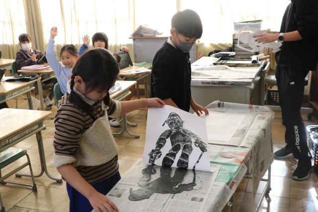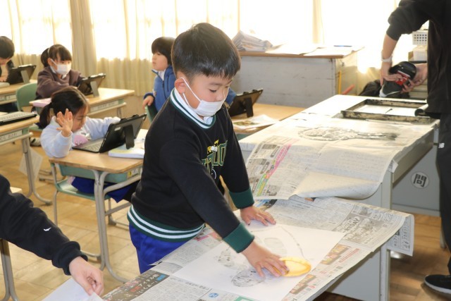 紙版画をすりました。どんな作品が完成するのか興味津々で、真剣に取り組んんでいました。