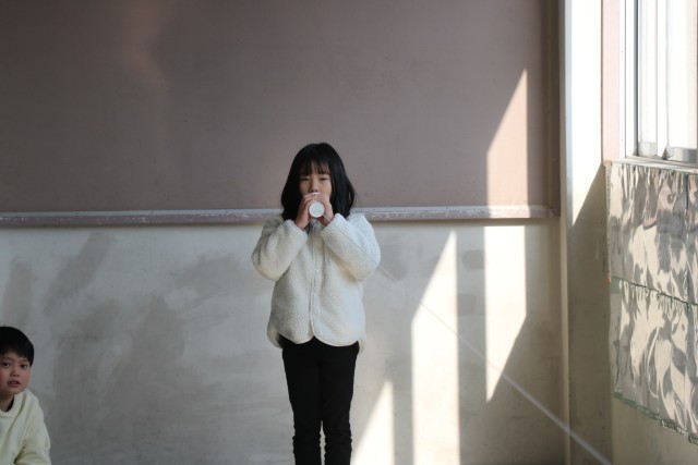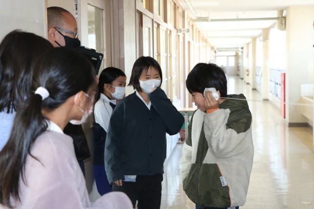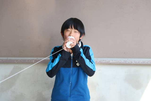 3年3組は、「ペアと話したい」という願いを基に、糸電話の研究をしてきました。今日は、3年3組(北館2階)と5年2組(南館3階)を糸電話でつなぎました。糸が校舎中に張り巡らされました。声が伝わったときには、歓声があがりました。