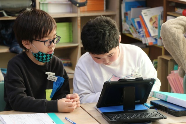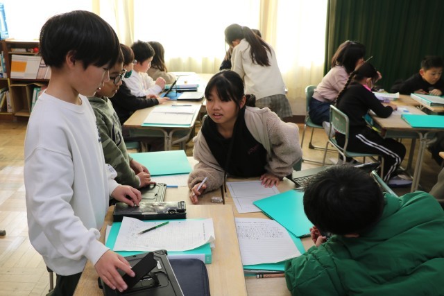 総合的な学習の時間のテーマは、「私の幸せ、みんなの幸せ」です。今まで、車いすの体験などをしてきました。車いす、ユニバーサルデザインなどのグループに分かれてまとめを行っています。その成果は学習発表会で披露します。