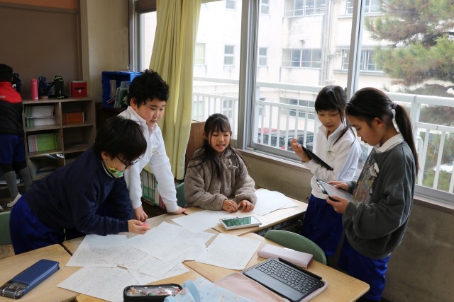 総合のテーマは、「私の幸せ、みんなの幸せ」です。グループでまとめ、発表練習をしました。学習発表会で披露します。