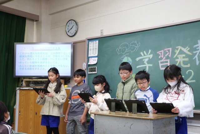 環境について、調べたことを発表したり、歌を歌ったりしました。盛りだくさんの内容で、みんな元気いっぱい取り組みました。