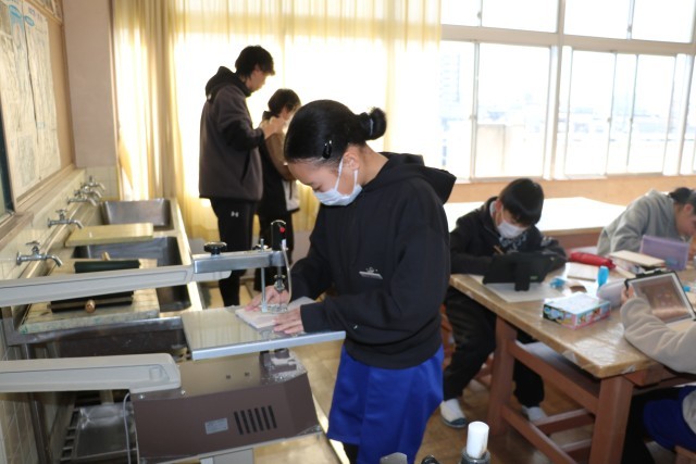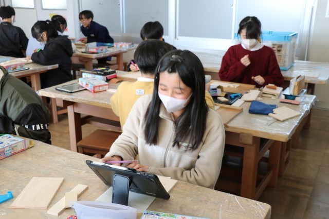 卒業制作の「セロテープカッター」を作っています。電動糸のこぎりや彫刻刀を使って、6年間のまとめになる作品を、自分で工夫して作っています。