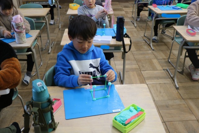粘土玉とプラスチックの棒を使って、箱の形を作りました。辺や頂点のことがよく分かりました。
