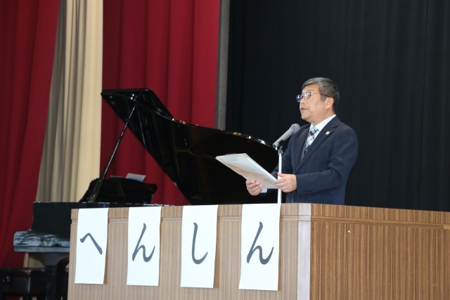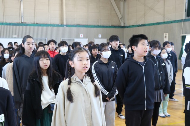 修了式を行いました。修了証授与、校長先生の話、校歌斉唱などがありました。校長先生からは、新しい自分に「へんしん」していこうという話がありました。今年度最後の校歌は元気いっぱい歌いました。