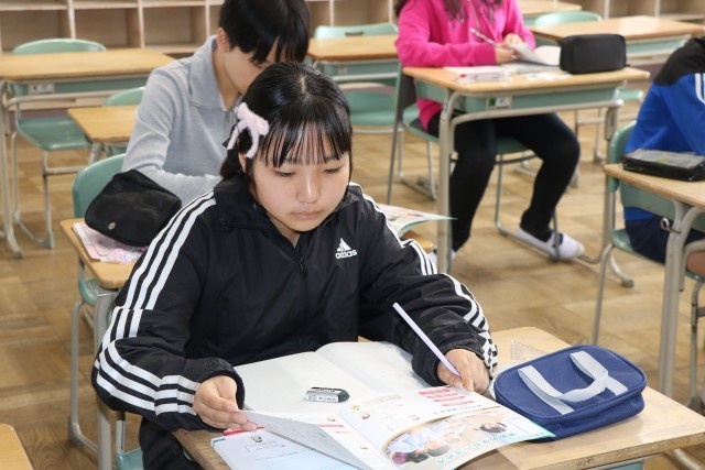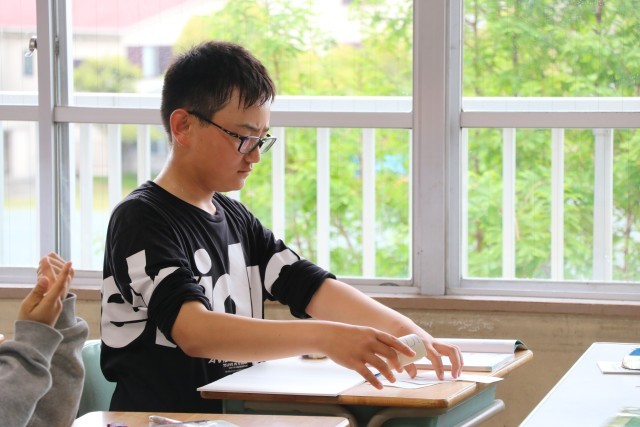 6年生の算数は少人数で行っています。線対称な図形の性質を調べようを行いました。みんな集中して取り組んでいました。
