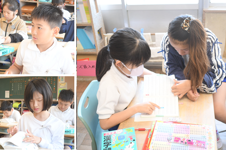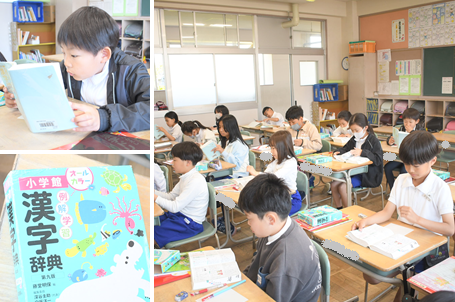 「漢字辞典」の使い方を勉強しています。部首索引や総画索引を使って調べたい漢字を見つけています。慣れてくると、だんだん早く見つけることができるようになります。