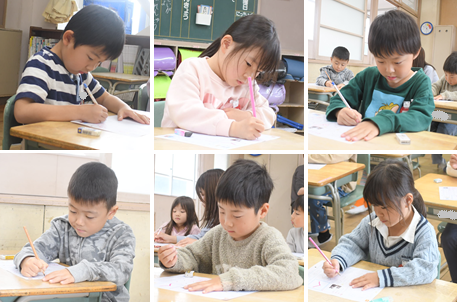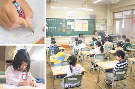 「ひらがな」の練習をしています。「くま」「くじら」「くだもの」など、「く」のつく言葉を練習しました。