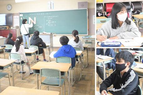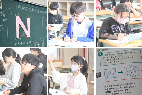 対称な図形の学習です。学級を2クラスに分け、少人数で授業をしています。線対称の図形と、点対称の図形の違いについて学びました。