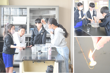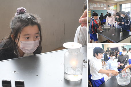 「ものの燃え方」の実験を行っています。「窒素」「酸素」「二酸化炭素」を入れたそれぞれの集気びんに、火のついたろうそくを入れると、どうなるでしょう・・・?