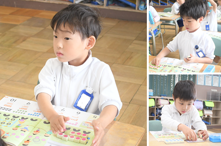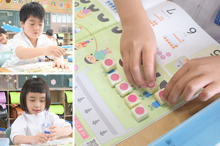 「10までの数」の学習です。教科書の挿絵の上に数図ブロックを一つずつおいて、10までの数を勉強しています。