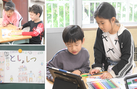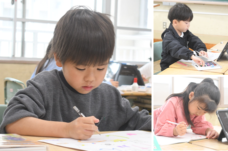 ポスター作りをしています。タブレットで撮影した、いろいろな教室や部屋の様子を絵に描いて、部屋の表示を作っています。