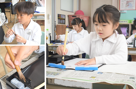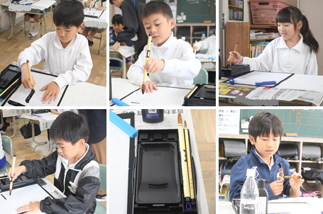 3年生は初めての毛筆になります。今日は筆の持ち方を習い、いろいろな線を書きました。新品の硯に墨汁を入れ、新品の筆に墨汁をつけるときには緊張感が伝わりました。