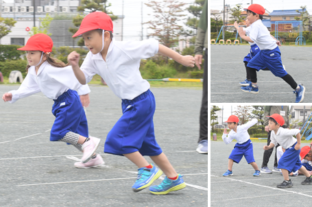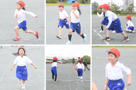 体力テストの練習をしています。今日は50m走のタイムを測定しました。速く走るコツは、まっすぐ走ること、ゴールをかけ抜けること、しっかりできたかな?