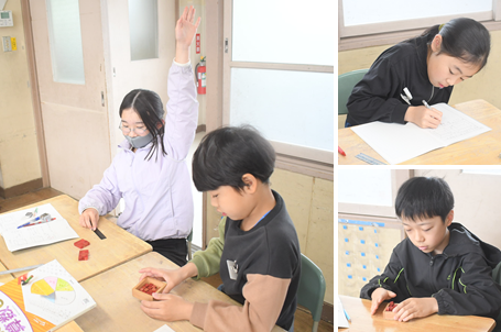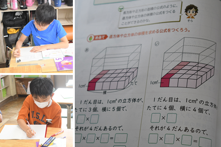 立体の体積を求めるために、1㎤のブロックを並べ、積み重ねて、いくつあるのか数えています。