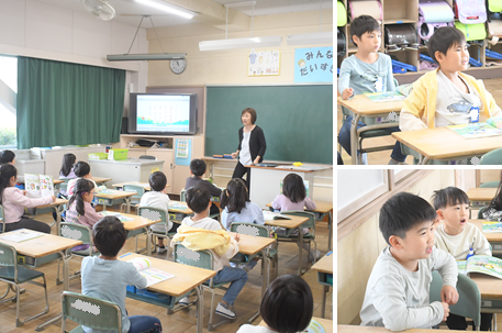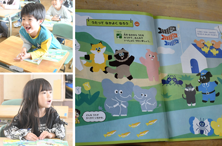 教科書の絵の中に「童謡」に出てくるキャラクターがたくさん隠れています。みんなで見つけて、楽しく歌っています。