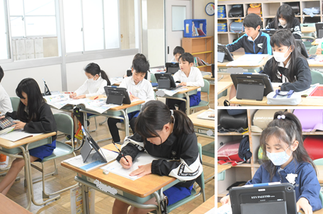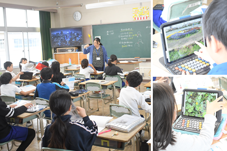 観察した草花や生き物を記録する「記録カード」の書き方を学習しました。前回の理科の授業で撮影をしてきた春の草花、生き物の写真を見ながら、記録カードに記入しています。