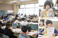 4組の書写の様子です。5年のまとめとして「星ふる町」という字を書いていました。ここまでに習った、組み立て方、大きさ、点画のつながり等を意識して書きます。1回目に書いた自分の字を見て、次はどこを直すといいか考え、2枚目に進んでいました。