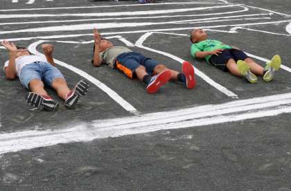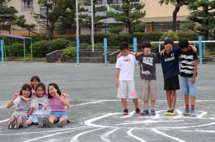 社会科の授業で学習した、奈良の大仏の大きさを実感するために、運動場に描いてみました。