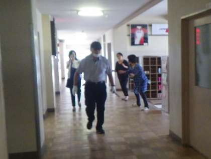 不審者が校内に侵入した場合を想定して、児童の安全確保、110番通報、不審者の確保のためにどのように職員が動けばよいのか訓練をしました。