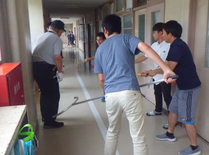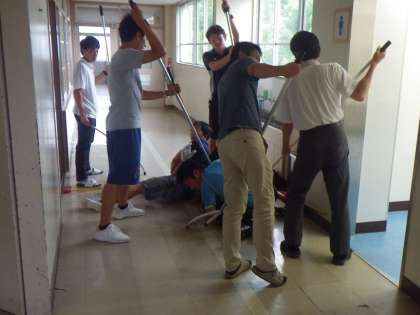 また、先生方は「さすまた」の使い方や、不審者への対応の仕方などを研修しました。