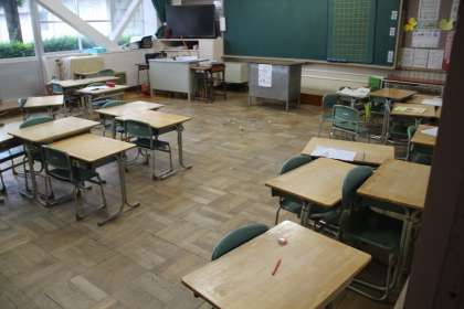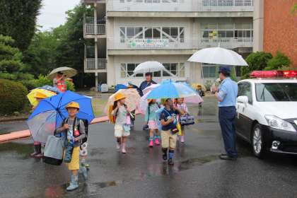 不審者侵入対応訓練をしました。みんなが体育館へ移動したあとの教室……机を寄せてバリケードをつくり簡単には入られないようにしていました。その後、体育館では、先生たちが講習を受けました。さらにその後、安城警察署のおまわりさんが下校する1年生に「気をつけるんだよ」と声をかけてくれました。「わぁ、本物のパトカーだ」「優しいおまわりさん、ありがとう」「さようなら」……元気にあいさつしていました。
