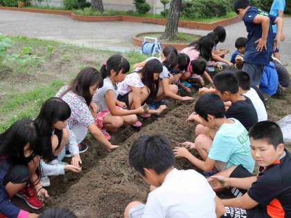 インゲンマメを用いた「植物の成長に日光と肥料は必要か」を調べるための実験と観察が終わりました。育てたインゲンマメを移植(定植)するために、クラスのみんなで畝を作りました。天候もほどよく、絶好の農作業日よりでした。