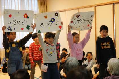 最後には、参観者の方と一緒にラジオ体操をしたり、歌のプレゼントをしたりしましたが、どの発表に対しても温かい拍手や反応を返していただき、充実した会になりました。