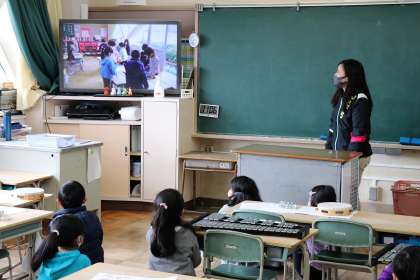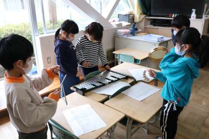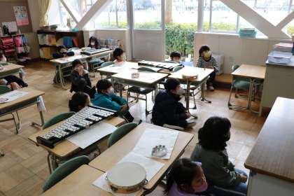 すずとトライアングル、タンバリン、鉄琴を使って「かまどたんじろうのうた」を演奏しました。前回の授業で演奏した様子を動画でふりかえり、上達したことを実感していました。みんな楽しく演奏していました。
