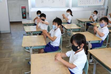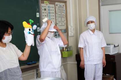 安城市給食協会の方と、北部調理場の調理員の方を会招きして、給食出前講座を行いました。調理員の方が、身についた小さなほこりも見逃さず、作業前の入念な手洗いを2回行い、一度に1000人分の主菜をつくることができる釜を使って、子ども達の顔よりも大きい「スパテラ」という道具を使って、焦がさないようにかき混ぜながら調理していることが分かりました。