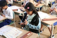 高齢者疑似体験を行いました。字を書いたり、はしを使ったり、階段の上り下りをしたり...