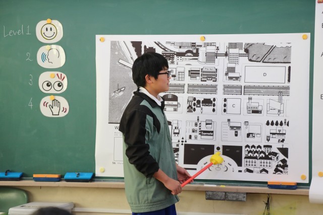 黒板の地図をもとに、道案内をしました。流ちょうな英語で話す児童が多く、素晴らしか...