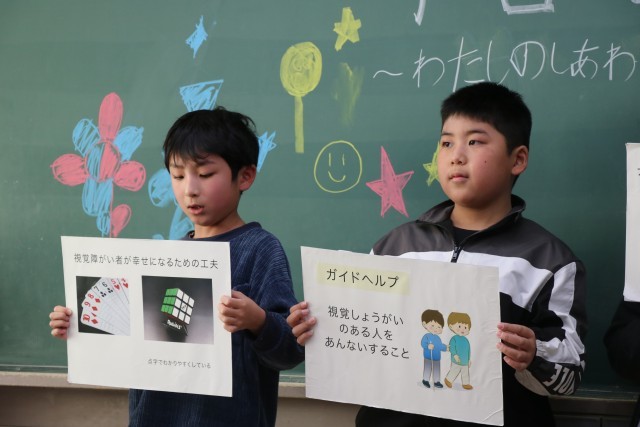 「わたしの幸せ、みんなの幸せ」をテーマに、福祉学習の発表会をしました。車いすなど...