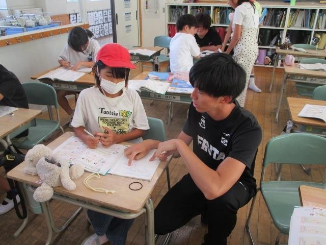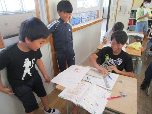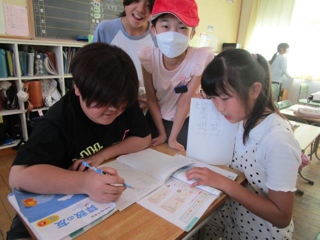 4年生が算数でわり算の筆算に取り組んでいました。分からないことを友達と教え合いながら、粘り強く取り組んでいました。